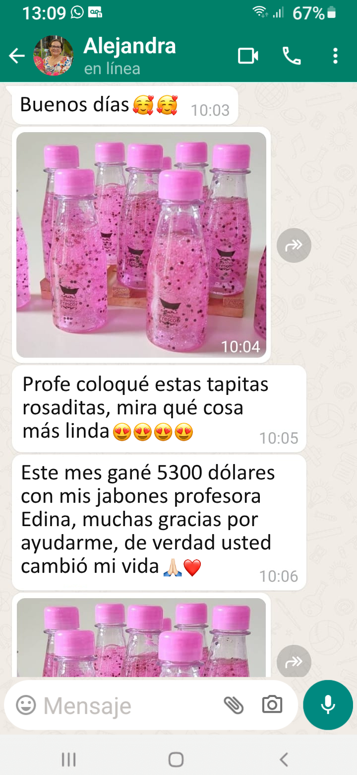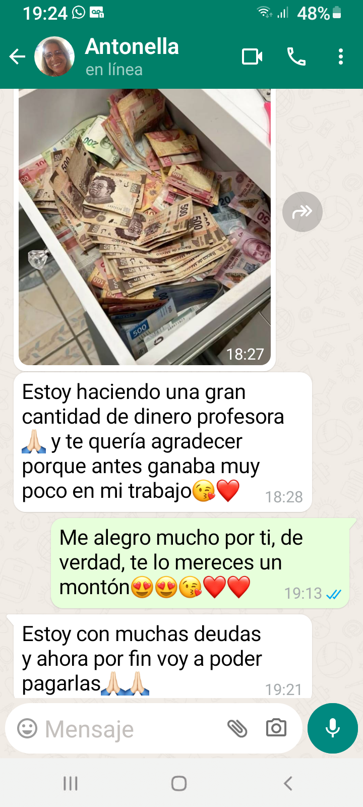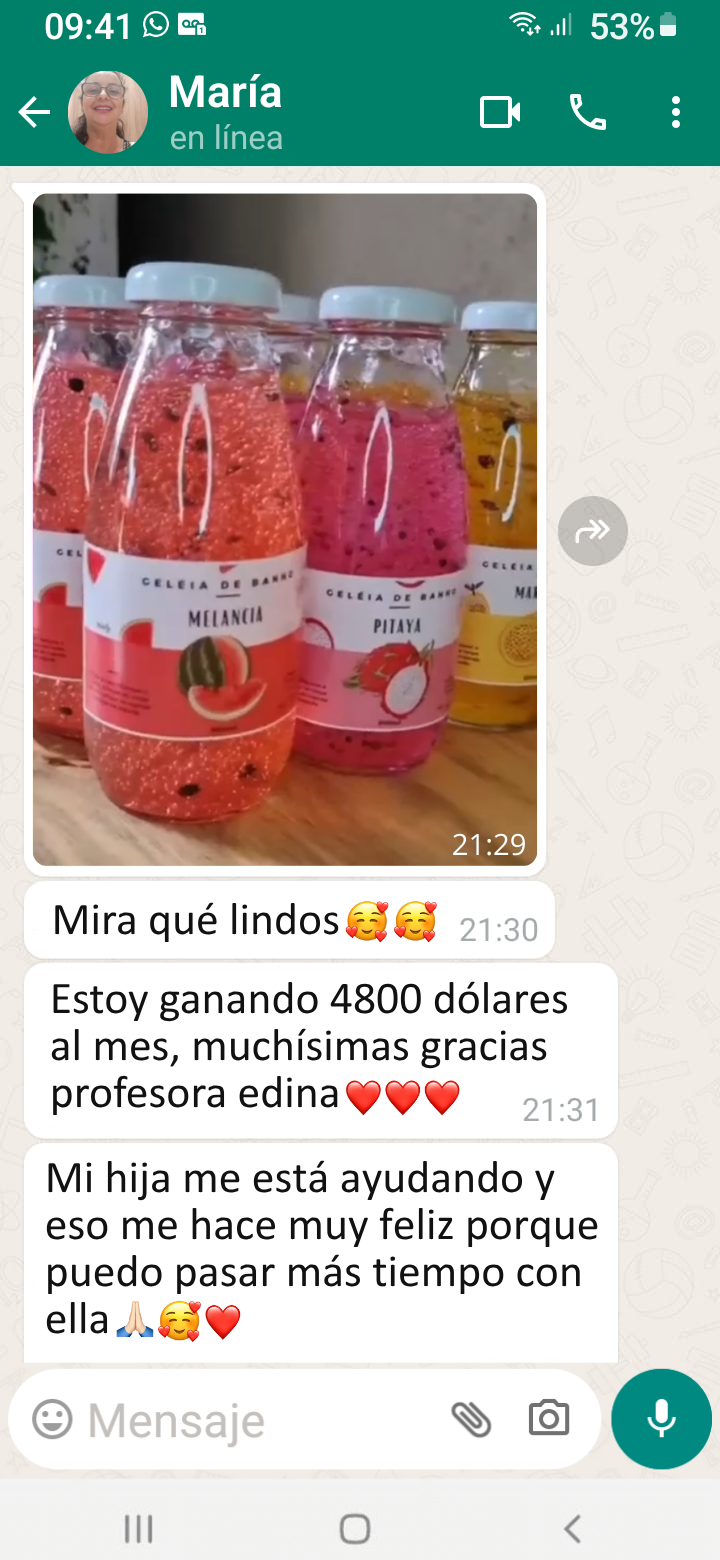Compré el curso hace 5 meses y hoy estoy ganando mucho dinero y ya no tengo que preocuparme por las cuentas, y eso no tiene precio. Muchas gracias, profesora Edina